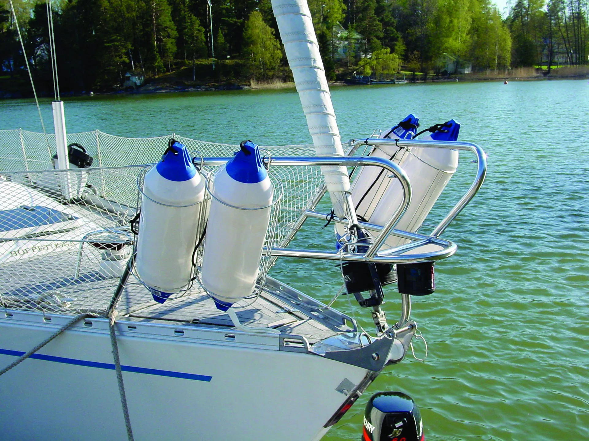 These stainless steel fender baskets fit tube or guard rails in any combination, providing a solution for storing fenders and preventing tripping hazards.