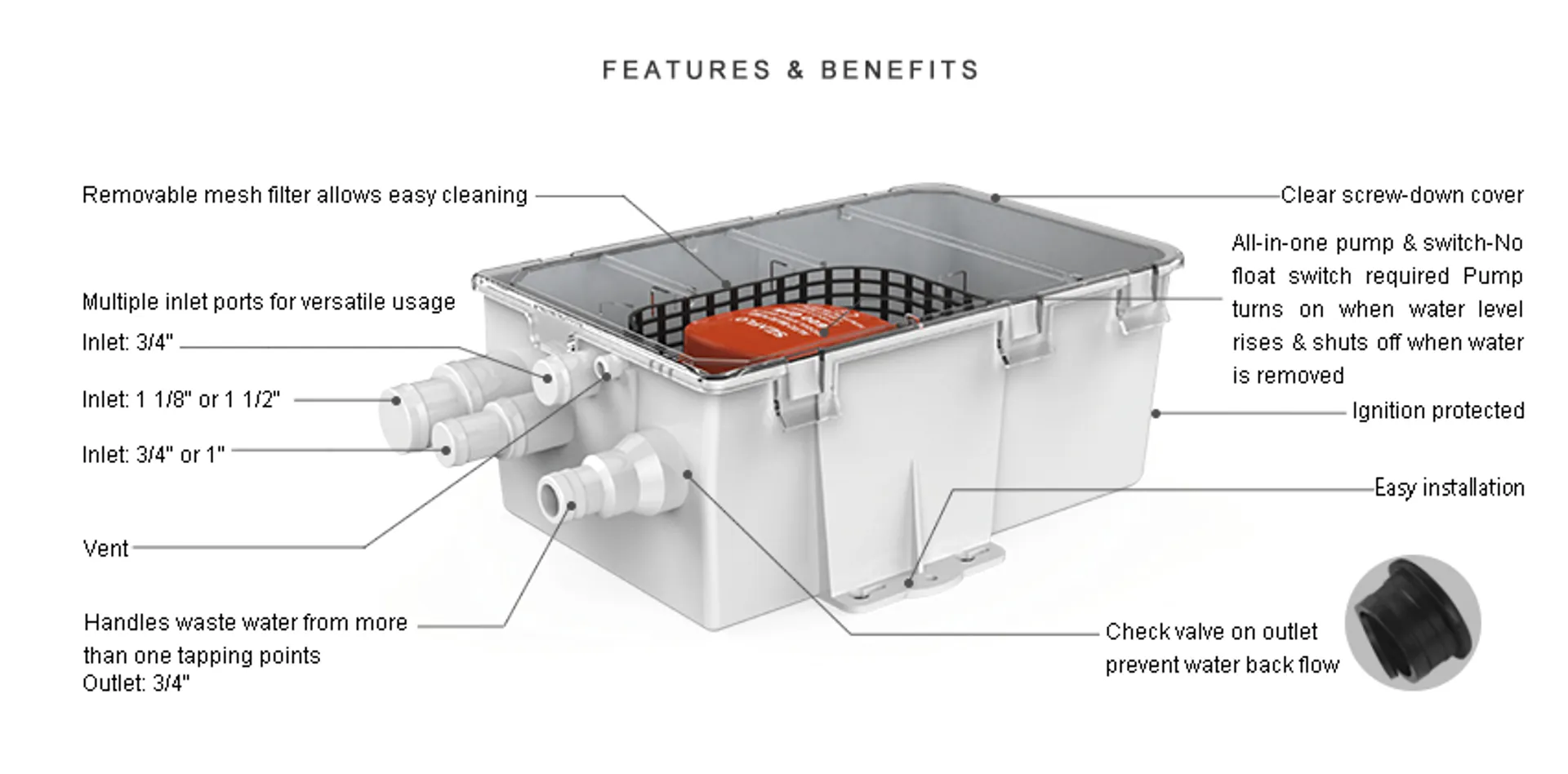 This system features a clear screw-down cover and a removable mesh filter for easy cleaning and maintenance. It includes a check valve on the outlet and is ignition protected for safety. The pump system is easy to install and comes with 18 AWG, 1m long leads.