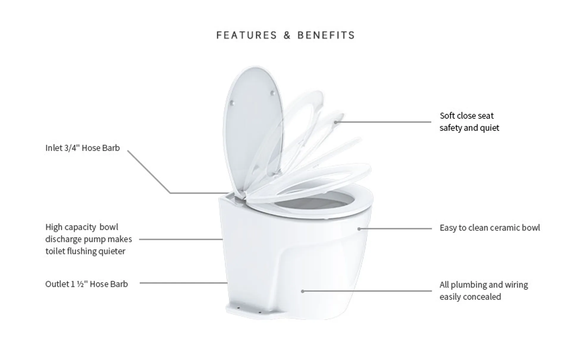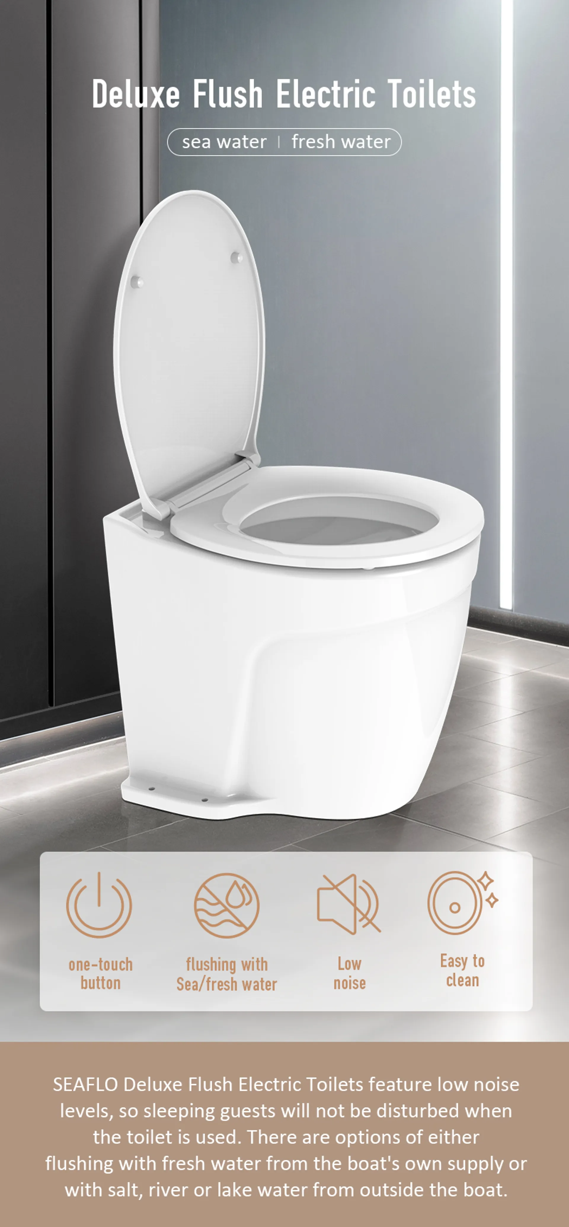 The Seaflo Deluxe Flush Electric Toilet features a built-in macerator and a high-quality ceramic bowl with a soft-close seat.