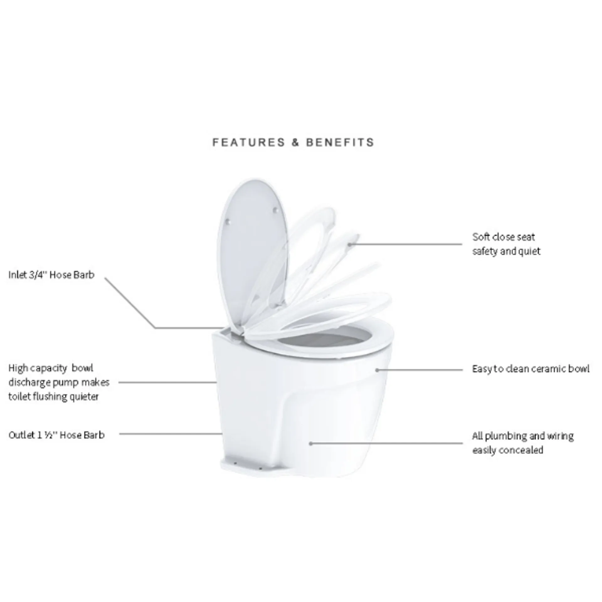 Seaflo Deluxe Flush Electric Toilets feature low noise levels, ensuring sleeping guests will not be disturbed when the toilet is used.
